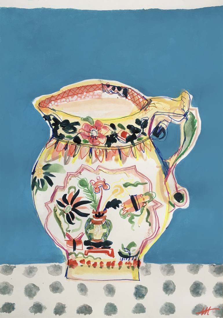 Painting, drawing and collage on watercolor paper of a beautiful antique jug.