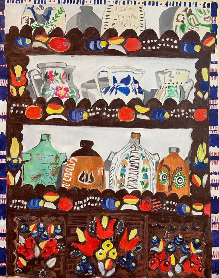 This colorful, vibrant painting depicts a traditional village shelf filled with pottery, jugs, and plates decorated with Hungarian folk art motifs. The edges of the shelf and decorative elements are surrounded by stylized floral patterns, red tulips, blue and yellow berries, and folk-inspired and be...