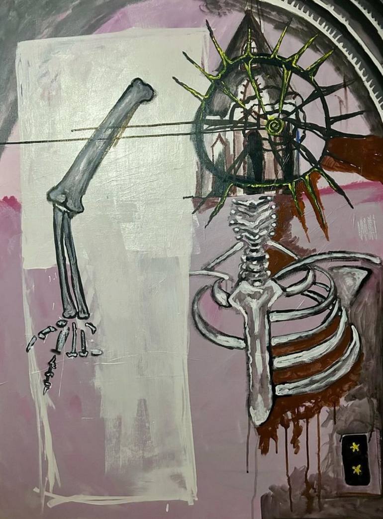 This surreal painting presents a skeletal figure partially integrated into mechanical elements, creating a haunting juxtaposition. The fragmented arm and ribcage contrast sharply with the vibrant green, spiked wheel, symbolizing a fusion of organic and inorganic. The muted, eerie color palette inten...