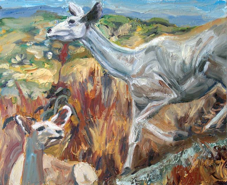 Like taxidermied animals, we're holding still in our human-made environments during this quarantine time. These paintings of dioramas, mostly from the Los Angeles Natural History Museum, are my version of virtual travel.