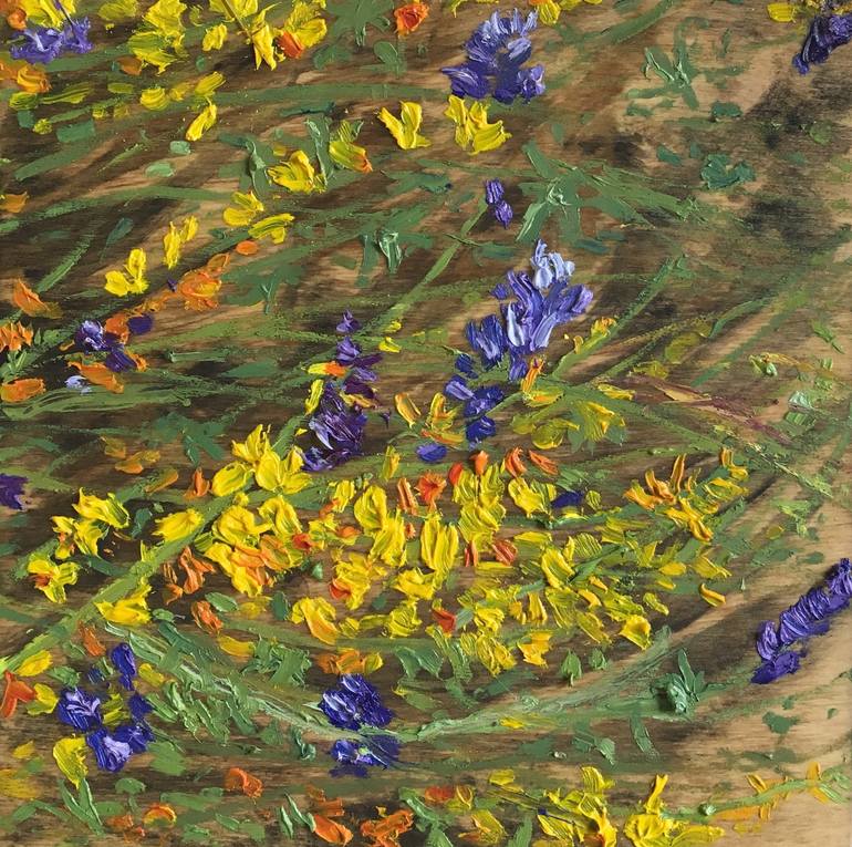 Painting: Oil on stained wood panel. Painted outside on location at Mugu state park in Southern California during the height of wildflower season. Deeply textured colorful wildflowers were painted over a loose charcoal sketch secured with oil medium. A very expensive piece that contains only essent...