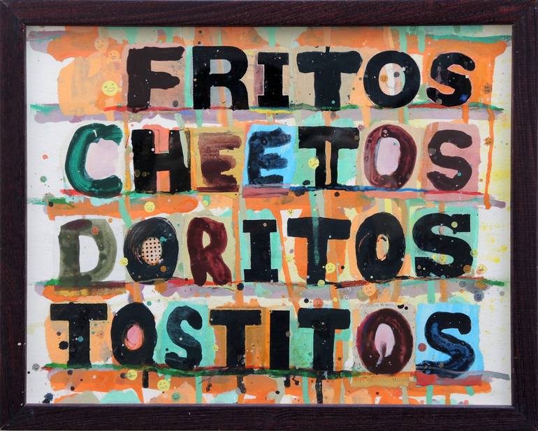 My love of lists, patterns, typography, and food comes together in "Delicious Chips". Celebrate deliciousness with this list of four popular brands of chips! This original, mixed media collage would make a fun, modern addition to any kitchen decor! Bon Appetit! "Delicious Chips" is framed using arc...