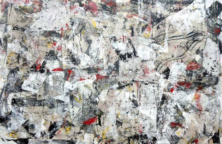 Gestural abstraction with collage elements on stretched canvas. Ships in a crate ready to hang with hardware included.