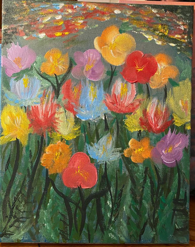 I hope when you view this you feel the same as I did when I was painting. As with all my painting, I never know what is going to end up on the canvas. I paint with my emotions and I dug deep with this. The flowers are beautiful, but there’s also some mystery behind them.