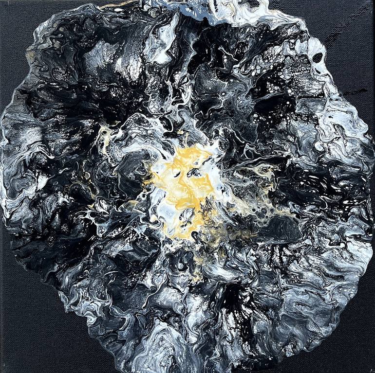 Descent into Darkness: The Consuming Desires This painting portrays the insidious nature of human desires as they spread through the world. Against a black backdrop, a flower-like form emerges, blending diffused white and black hues. This symbolizes the initial stages of evil desires taking root, w...
