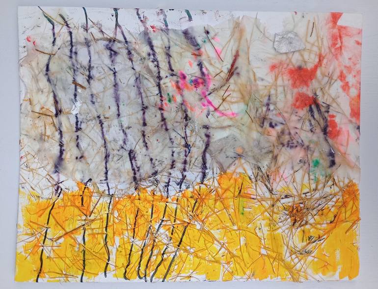 The Desert Series began on a trip I took out to Joshua Tree Park in California. I gathered local, dried grasses and collaged that into the artworks.