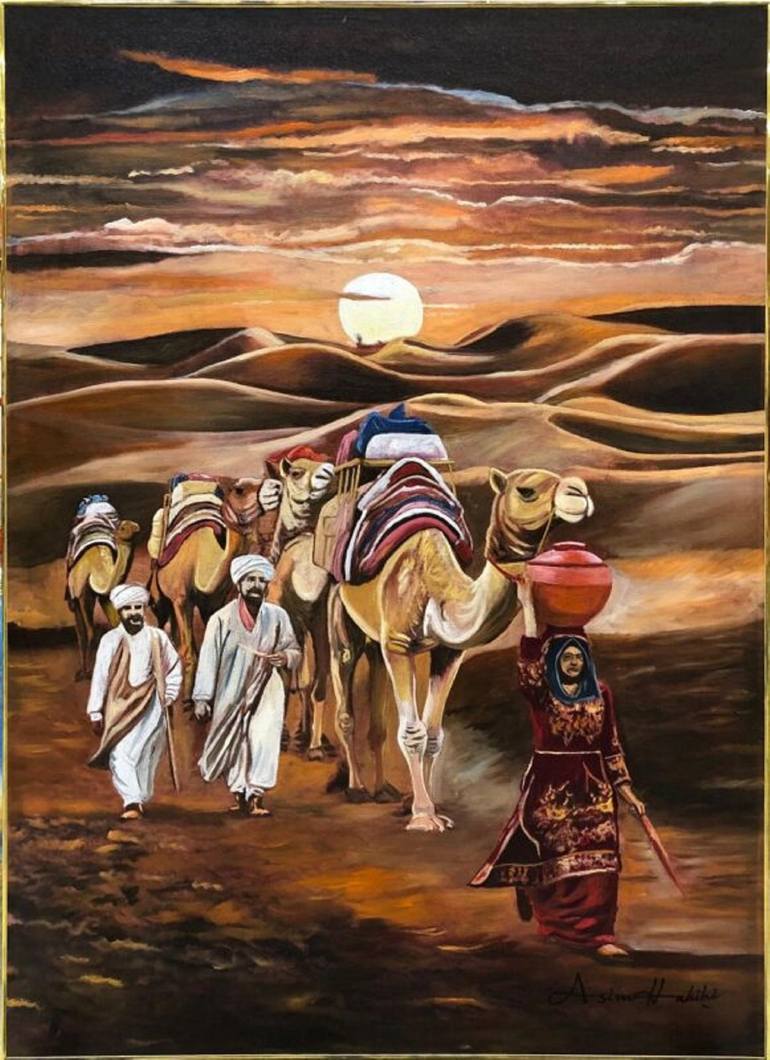 The artwork reflects the historical and cultural significance of desert life, portraying resilience, community, and harmony with nature. The warm sunset, rolling dunes, and travelers suggest themes of migration, survival, and tradition. It could be inspired by real-life desert communities or histori...