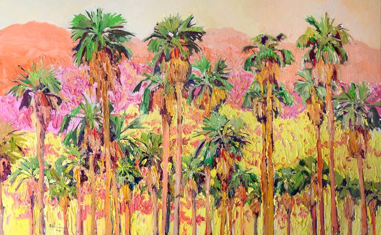 With impasto texture and thick-expressive brushstrokes, bold and bright colors the artwork represents the colorful beauty of the American desert, full of colors and contrast. Beautiful long shapes of palm trees standing in the background of high desert mountains all together look full of life, joy, ...