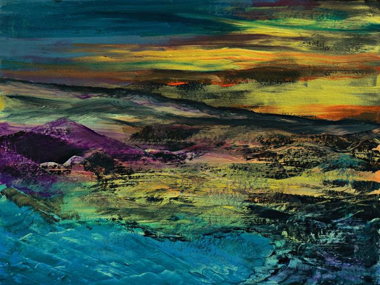 Acrylic paint on acrylic paper painting representing a stony desert landscape as its edge meets the sea while the sun sets on the horizon.