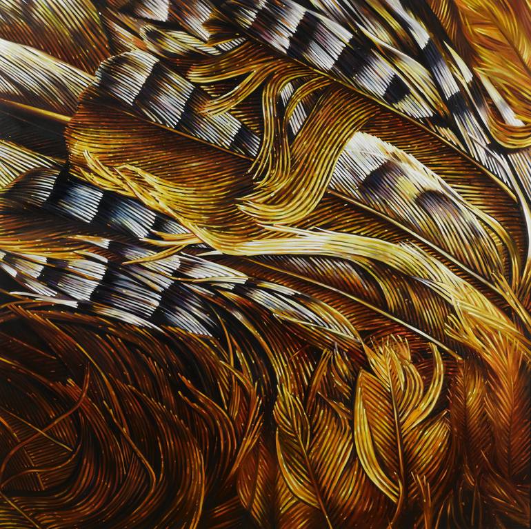 Zoom on feathers of a jay bird. Structures, light reflections and rhythems in a contrast of warm and cold colours. Brush strokes, dots and lines moves this kind of "blow-up" to an semi-abstract painting.