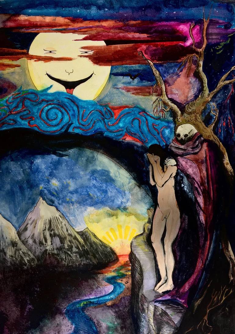 This is an illustration for a short story, it shows a dreamer stuck in a nightmare about to leap from a cliff, morpheus stands silently behind them, keeping them trapped in the land of dreams. This is part of a series of drawings i have done inspired by gothic horror and Freudian psychology.