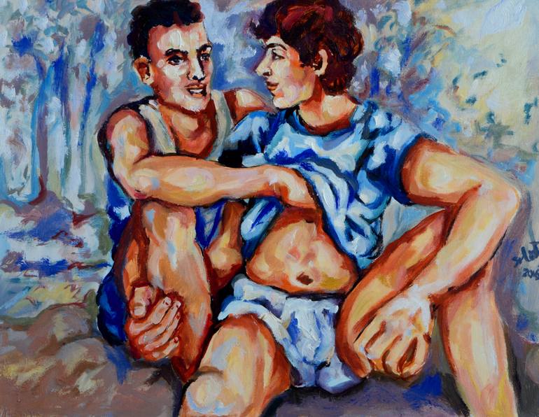 I was born and grew up until I reached adolescence, in a small town in the south of Jalisco, land of Tequila, mariachi and José Clemente Orozco, Juan Soriano, Raúl Anguiano, Juan José Arreola and Juan Rulfo. After a childhood marked by the tutelary restriction of religion, I gradually developed my imaginary world, which has since led me to an understanding of reality through the discovery of my own body. The body as a pictorial constant was introduced into my work, thanks to comic magazines, as well as religious representations, hence the constant references to these signs and their particular visual discourse. The nude has been a part of my work since my early days, when – still a teenager – my father tried to censor the use of my newly discovered sexuality as a subject of my art. From then on, the representation of the nude, predominantly male, has symbolized for me the possibility of expressing myself as an autonomous individual, owner of every part of myself and capable of exercising my right to enjoy and manage it. Nudism, as a kind of liberation, not helplessness, permeates my works in which men discover themselves and others, enjoying the possibility of meeting, comparing and relating through the senses and physical contact. In art as the religion of my life, I touch the limits of desire and its realization, while I paint men who, by containing their forces, project them as vibrations that tense the environment recharged by buried homoeroticism and the spirit of the male that tries to impose itself on its competitors.