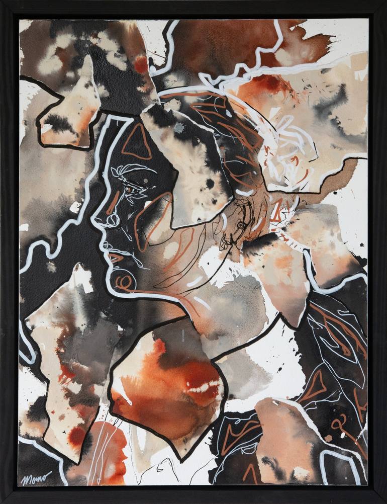 "Dichotomy no.2" continues the themes of the "Two Faced" collection which explores the dichotomy of the faces we put on for the world and those that we only know. The Dichotomy paintings were completed on watercolor paper mounted on panel and placed in a black floating frame ready to hang.