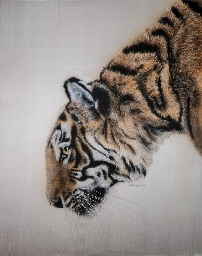 Tiger portrait “Dignity” is painted on pure white silk by brush with non toxic colors for Silk, fixed and will last over 100 years. The grace of the Tiger with luxury shine of pure Silk it makes artwork truly special. Silk enhances tiger’s beauty and adds its power