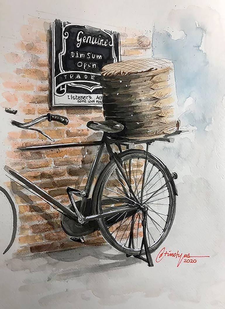 "This painting captures the traditional street vendor scene of a dimsum delivery cyclist leaning against a brick wall in Karawaci, Tangerang, West Java, Indonesia. It preserves the culture and tradition of local street food and the artist used Canson 300gr. paper, Daler Rowney watercolors and a Lyra...