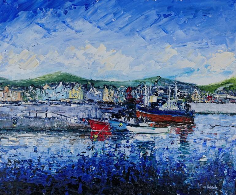 I love to go to Dingle, such a pretty town, and there are always colourful fishing boats bobbing on the water. Using the palette knife, I have painted in an impressionist manner, and the palette knife enables speed and spontenaiety.