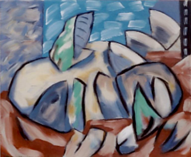 Description: A painting reminiscent of a still life from the era of synthetic cubism. It was done in anticipation of a dinner appointment in Paris with the great Breton painter, Tristan Bastit.Medium: oil on canvasYear Created: 2001