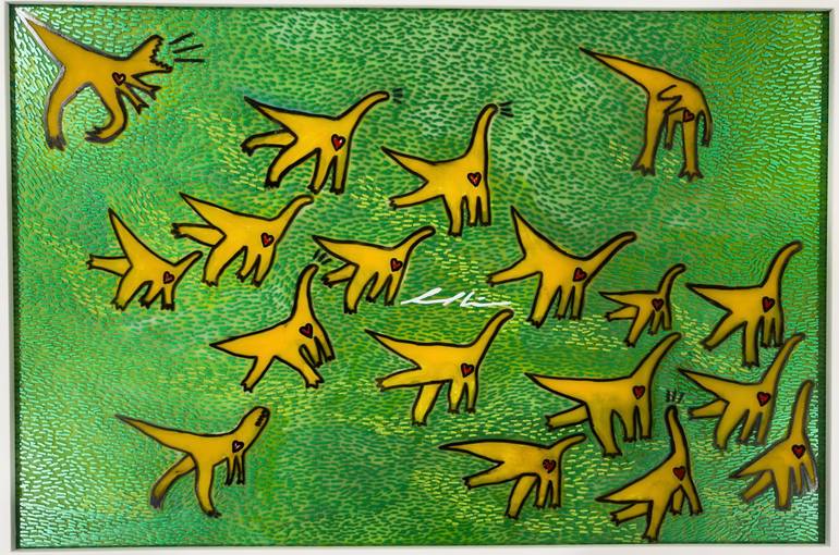 Through dinosaurs, I tell stories of love, evolution, and empathy—loud, raw, and full of color. My work blends pop art with neo-expressionism to show that even the fiercest creatures carry hearts. These prints are mirrors of me: wild, feeling, and always evolving. I'm the artwork—these are my prints...