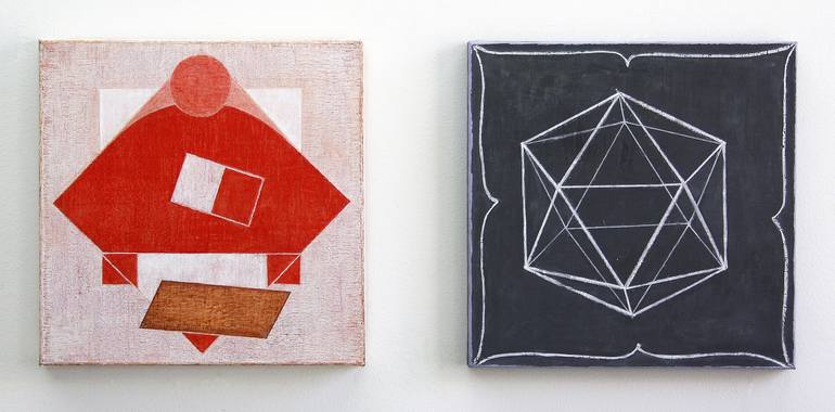 Total size of the diptych in the series Explanations: 40 x 92 cm. Each part: 40 x 40 cm. Space between: ab. 12 cm. Inspiration: Pantocrator Icon (left), Icosaedri / Polyhedron (right).