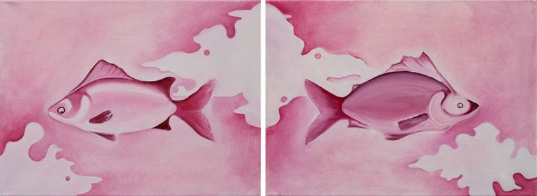 This diptych represents that feeling when you and your partner are physically apart, but emotionally, you’re still close. I tried to capture that sense of missing someone but knowing that your connection holds you together. The two fish are swimming in opposite directions, yet their paths are mirror...