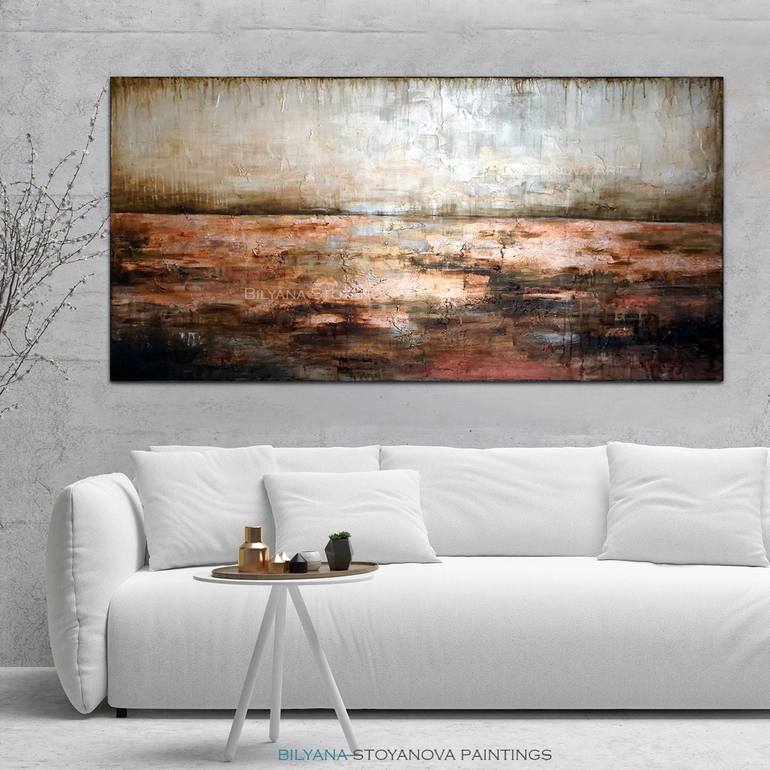 Contemporary Luxury Horizontal Oriented Artwork with distressed finish, Warm colors painting, Metallic colors, Burned orange, bronze, gold, silver painting, Relaxing paintings One-of-a-kind ORIGINAL PAINTING - Direct from the artist Bilyana Stoyanova Ready to ship 2-3 days of payment. Worldwide sh...