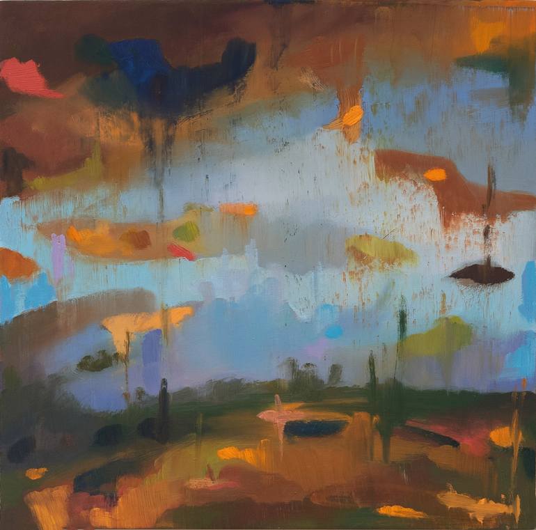 I use the landscape as a form of escapism. Escapism is common in fiction, but less so in visual art. I want to create worlds that feel like stories I read as a child, places where everything is possible, where things that seemed static suddenly move and become alive (like rocks or trees moving around like clouds). Why landscapes? I don’t come from a traditional landscape painting background; I don’t use photographs or work from references. I am world building, creating something that doesn’t exist and playing with contradictory terms. It’s that purgatory between the real and the unreal. The land and the air. Between knowing and not knowing. It’s about discovering a line between imagination and memory and losing myself in that space. I am currently taking my paintings and turning them into installations, to create a movable changeable landscape, where the viewers can “step in” and create their own place by moving parts of the landscape around the canvas by way of magnetic shapes. My paintings of imagined spaces become magical places to wander through and explore, so that the world is a bit more beautiful and surprising. Artistic Process I work on multiple paintings of imagined landscapes in multiple series at the same time so that in my studio, I am surrounded by everyday strangeness. I anthropomorphize these human-less landscapes with their clouds and sky and lands and rocks. Parts of the landscape break away (or come together) becoming their own active subject, playing, moving and breaking away. I paint by picking one color, one shape at a time. My process feels like exploring a new place, I add pigment, scrape paint down, spray, repeat. It’s a silly and chaotic process full wrong turns and dead ends, flitting from place to pace (or piece to piece). And in the end, I want to feel like I opened a new world, full of strange mystery and magic.