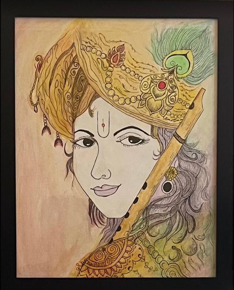 "Divine Krishna" portrays Lord Krishna in a serene and composed manner. Adorning his wavy hair is a single peacock feather, a symbol of his connection to nature. His royal headgear graces his noble countenance. This portrait radiates a profound sense of inner calm, inviting viewers to connect with...