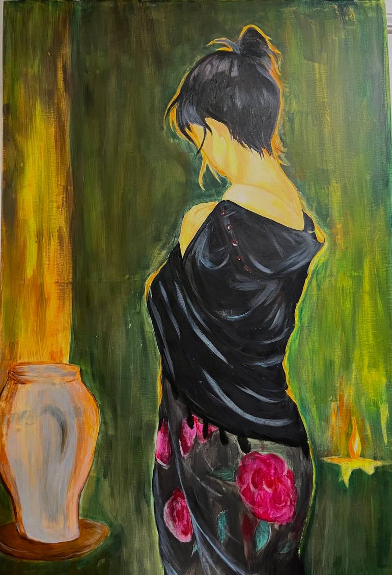 She wears black—not for mourning, but for the shadows that cling to her skin like unspoken vows. The green behind her is not hope, but the eerie glow of a world that moves while she stands still. A candle flickers; a vase sits empty. Both are mirrors. I painted this in the thickest hour of my lon...