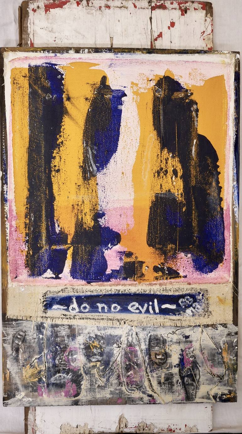 I have always been intrigued by the three wise monkeys, hear, see , speak no evil ever since seeing it on an ancient aunt's mantle piece. This is my version 'do no evil' although today one could easily add 'admit no evil'! The acrylic paint is on canvas applied to a recycled wood panel mounted on ...