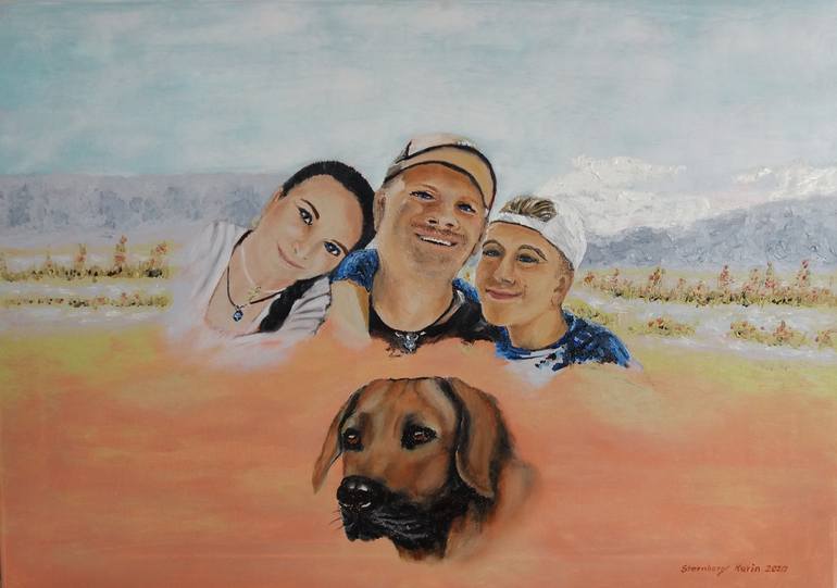 "Dog always think happy", 2020, oil on canvas, 50cm x 70 cm. A portrait of the family with dog of my girlfriend. Many pet owners know how happy the connection between animal and human is. Signed on the front right. with hanger to hang on the wall