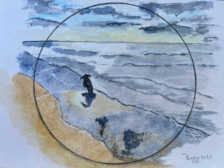 Dog running on the beach Since I walk in nature for hours every day, I wanted to show this on paper and watercolors. I wanted others to enjoy the peace it radiates. Lovely run on the beach with my dog in the afternoon, it was already starting to get dark with a light orange glow, the dog was wet f...