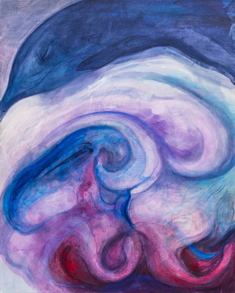 Dolphin surfing wave. Intuitive painting. Bicolour