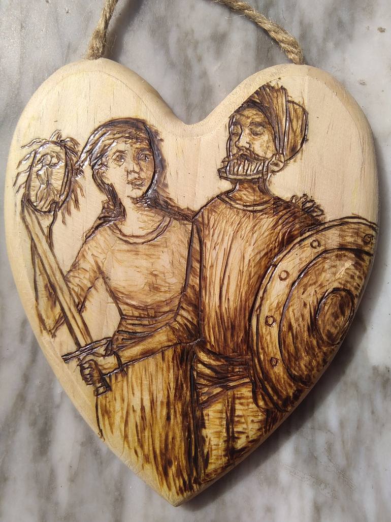 my work is inspired by the famous Spanish classic: Don Quixote My work represents the famous couple: Dulcinea and Don Quixote. My work represents the admiration that Dulcinea feels for the famous gentleman My work is a beautiful pyrography made on wood of excellent quality