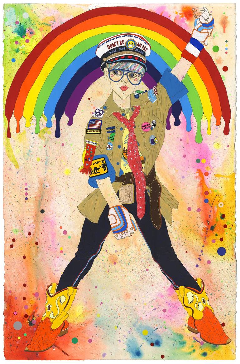 From a series of art created in lockdown, exploring self portraits in the image of my nephew and nieces. My nephew Wynton styled as myself, with a nod to the Coronavirus pandemic, social distancing and mask wearing. Mixed media on cotton rag.