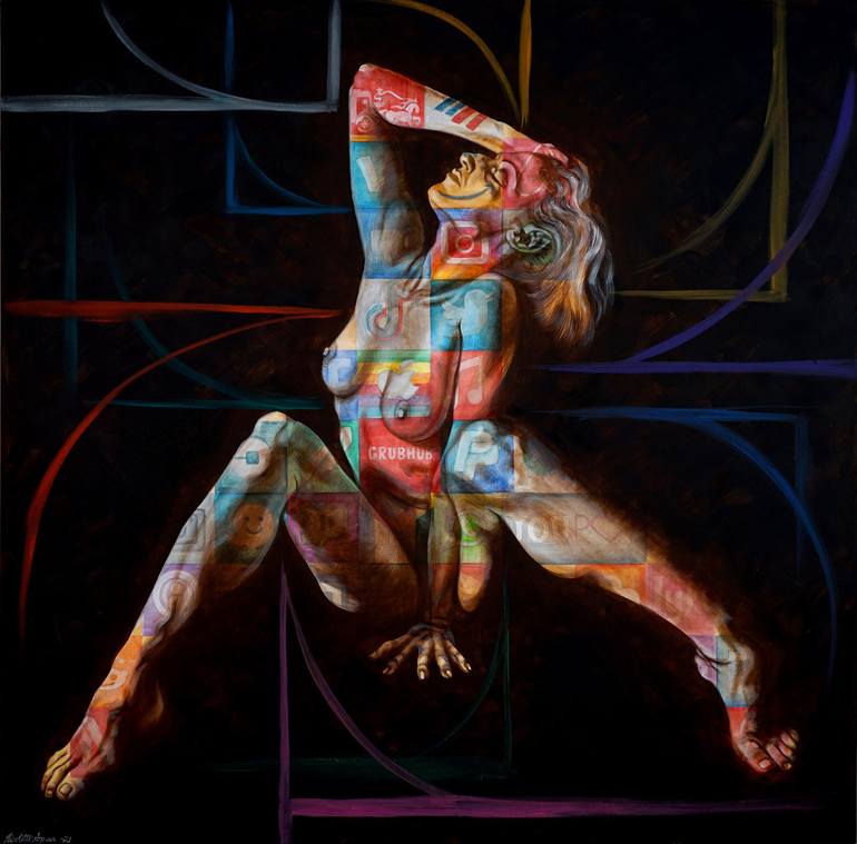 This painting is inspired by the seductive relationship that we have to our technology and specifically with our cellphones. There is a hit of dopamine released in our brains every time we interact with the various applications on our phones and this fascinates me. It is not necessarily a negative r...