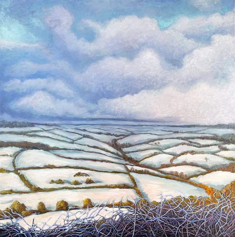 Dorset Snow 2 is an evocative oil painting inspired by the English West Country. Snow-covered fields and ancient drystone walls reflect generations of agricultural life etched into the land since Neolithic times. The artist explores how location shapes family and social history, with paddock structu...