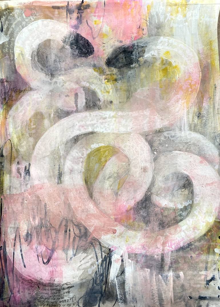 This work is inspired by a dream I had about two serpents dancing. It includes poetry and calligraphic mark making.