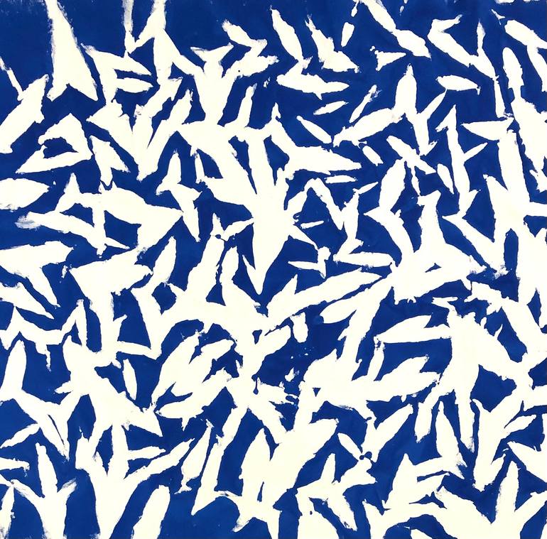 The white shapes in this abstract painting resemble a flock of white doves. The canvas was folded and clipped 200 times then painted and unfolded to reveal this intricate web pattern of the unpainted portions which happens to also resemble a flock of birds taking flight. This technique follows in ...