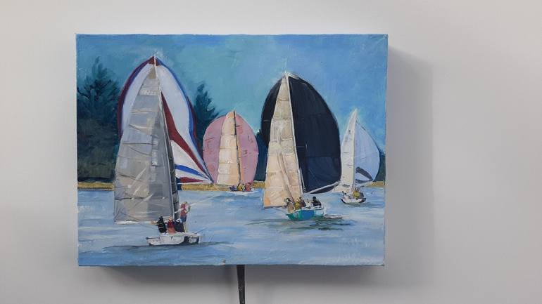 Racing up river past Norfolk Pines on a quiet day, spinakers always catch everyones eye.