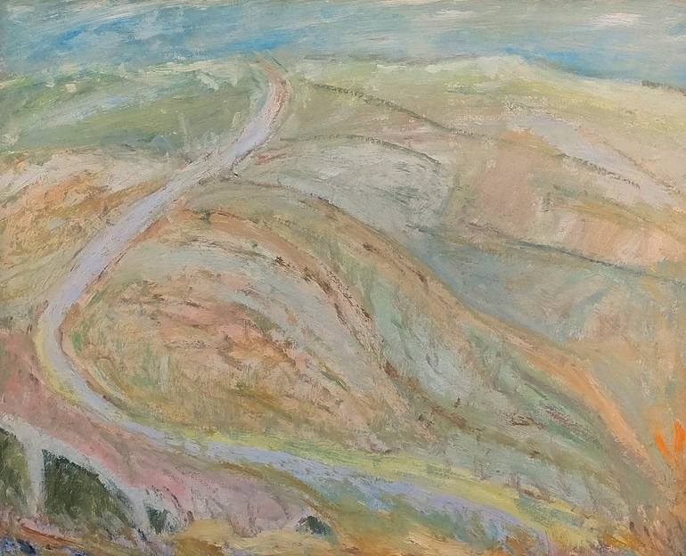 After been painting a few works with strong colors this time I chose palid ones to represent a path that goes down hill in the middle of a field with open air and place for nature to live. Fun with the colors and fun doing this work.