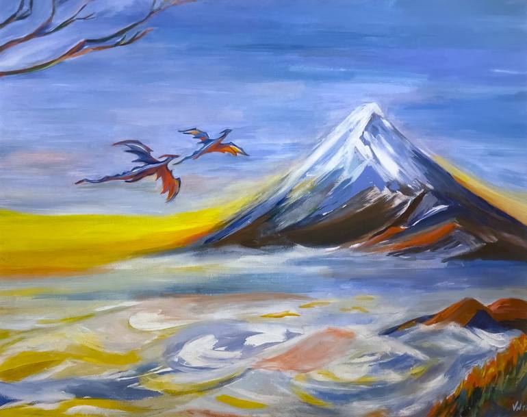 Two dragons fly to their home mountain, which resembles Mount Fuji both in appearance and shape.