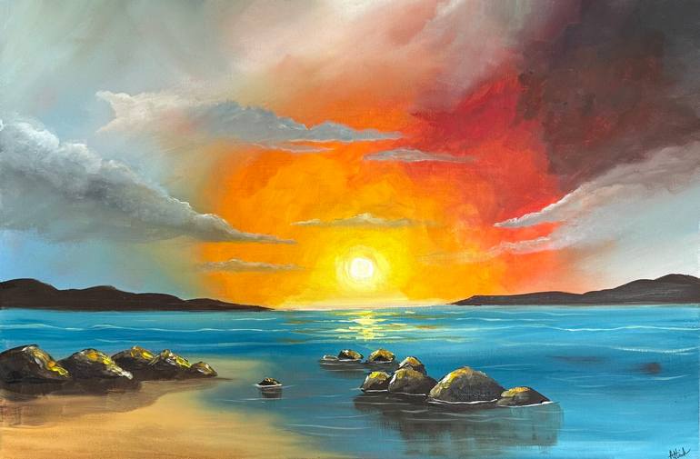 A dramatic sunset paints the sky with vibrant hues of orange, red and yellow as the sun dips. The clouds are tinged with deep blues creating a sense of calm and awe. The whole scene evokes a feeling of fleeting beauty, where the day gives way to the tranquil embrace of the night. This painting ha...