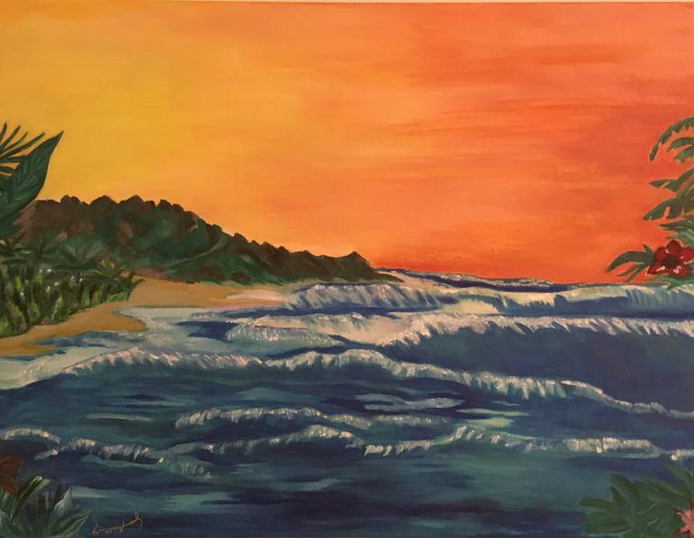 Inspired by my love of the ocean and orange sunsets. Gouache with a small touch of oil pastels.