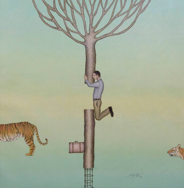 In this painting I have tried to show the nature of us humans who only look at our own benefits without thinking about the future. The society is full of such people, humans are cutting down forests to build their homes and places of luxury. But he also wants to protect himself from the animals that...