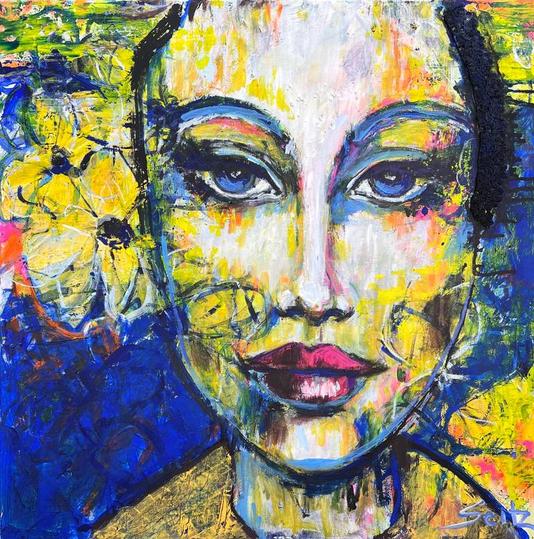 Before me unfolds a captivating painting, portraying an enchanting woman with a dreamy, almost somnolent gaze. The blue aura enveloping her is interwoven with yellow blossoms, unfurling upon a bed full of anticipation. A magical force irresistibly draws me into its enchantment as a spectator, as the...