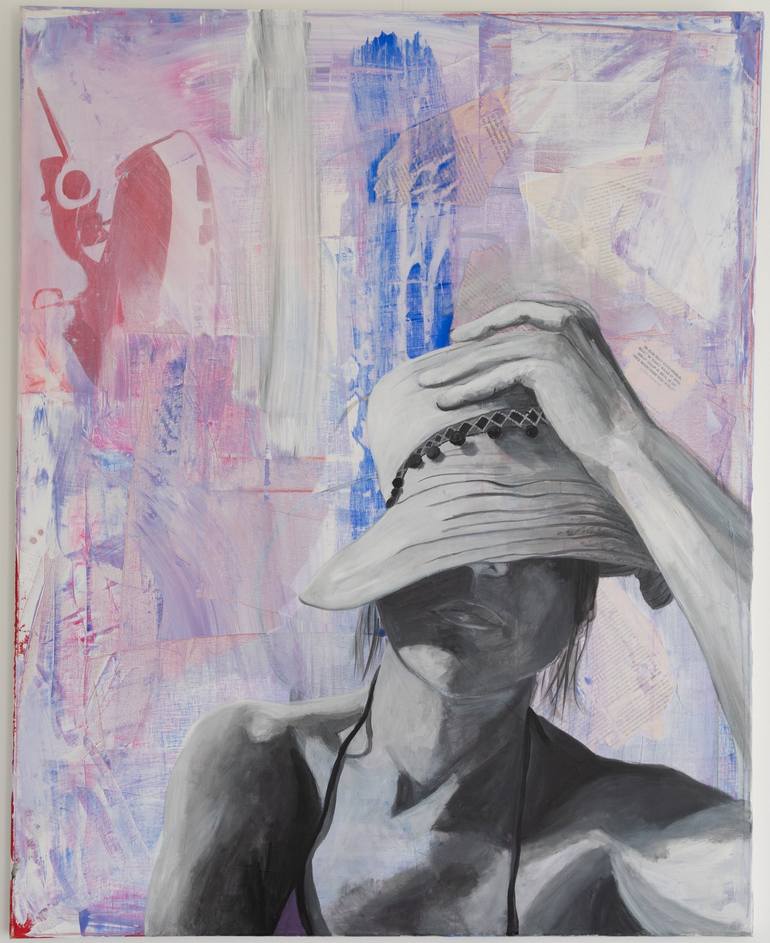 Céline Goekint is a Belgian artist, born in Ostend. She paints with acrylic on canvas. papers, journals, comic books, prints are often integrated in the canvas. In addition to acrylic paint, she also often uses spray paint and oil pastels. She uses comic figures. In her portrets she often choses for a black&white portret on a colorful background.