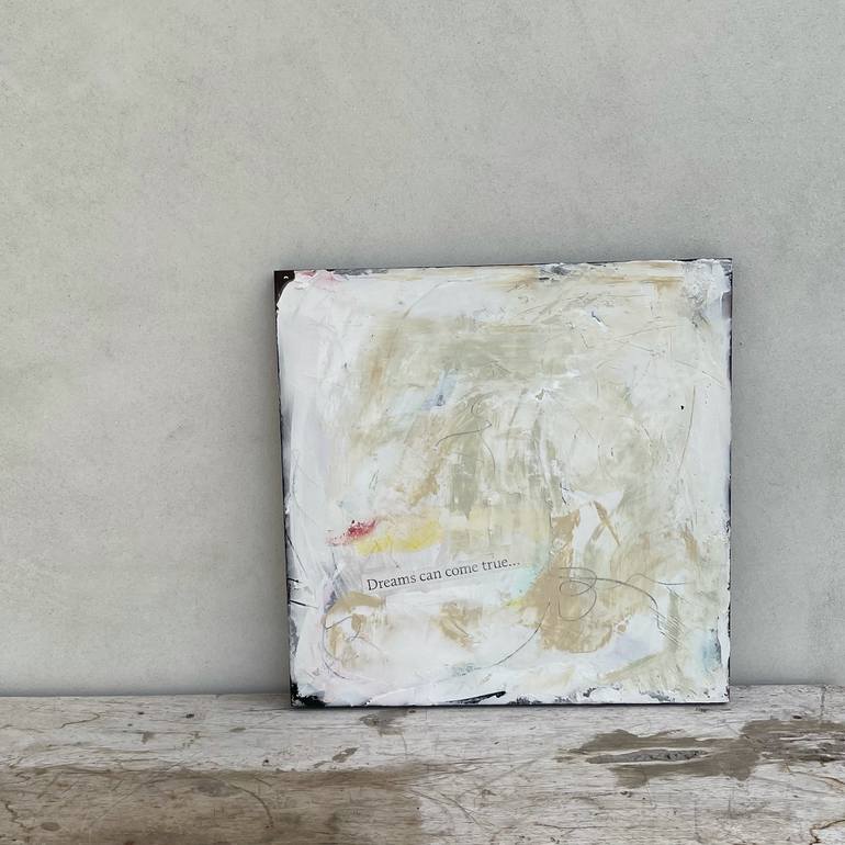 Dreams Can Come True has color and passion peeking through the layers and mediums. The black contrasting edge make this piece pop off the wall. The colors are focused around the text to emphasize the message! Loaded with texture and markings that make this one feel wild and free. Text reads: "Dream...