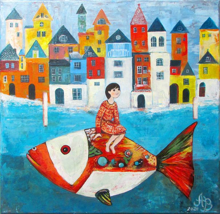 Embrace the spirit of adventure and the magic of dreams with this unique naive art painting, perfect as a gift or a statement piece. This whimsical scene features a young girl sitting atop a large, gentle fish, gazing into the distance over a river or sea. Behind her lies a vibrant village of colorf...
