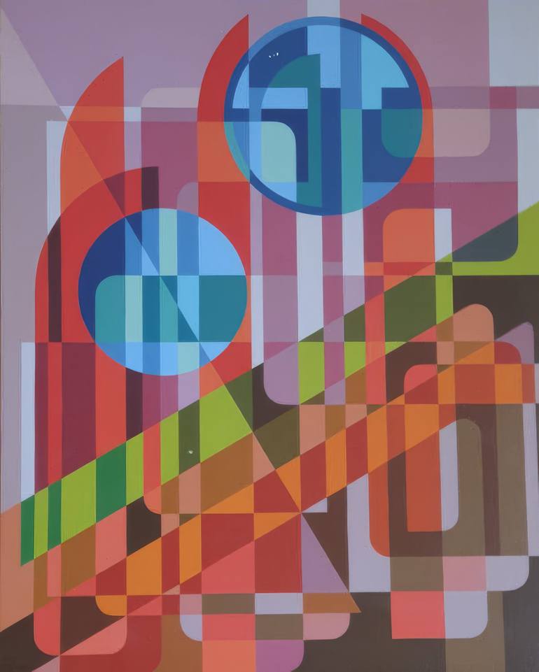 The painting radiates a sense of order and chaos beautifully intertwined, as if inviting the viewer into a vibrant dreamscape. It strikes a balance between geometric precision and expressive color play, resembling a modernist interpretation that feels both structured and spontaneous. The dominant bl...