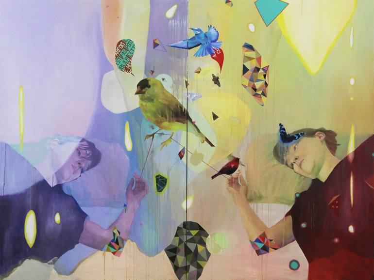 This painting is about duality, the past and the future. A person looks at his double in the future.